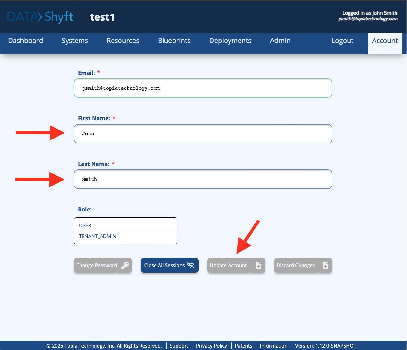 The Account Management view allows you to edit certain aspects of your account. You can update the name attached to your account, change your password, or close all open sessions. This view is accessed by clicking the Account item on the main navigation bar.