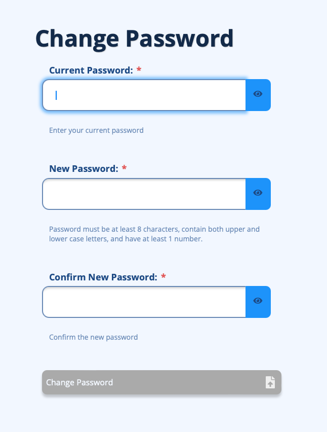 If there is any issue changing your password, an error message will be displayed explaining the issue. If the two new password fields do not match, an error is displayed and the Change Password button will not enable. If the new password does not meet the system's password complexity requirements, an error is displayed and the Change Password button will not enable.
