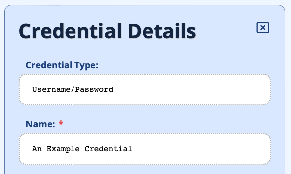 Selecting a credential from the credential list will open that Credential details view and display the information about the credential. The upper section displays the type and name of the credential, while the lower section displays the details of the credential (e.g. the authentication information).
