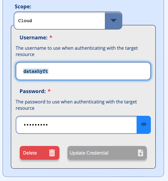 DataShyft supports defining credentials either at the tenant level (i.e. Cloud credentials) or within individual systems (i.e. Local credentials). Cloud credentials are available for use on any system, while local credentials can only be accessed by components running on that system. If a credential is defined as both a Cloud credential and a Local credential, the deployment will use the Local credential if it is available and will fallback to the Cloud credential if no local credential is available.
